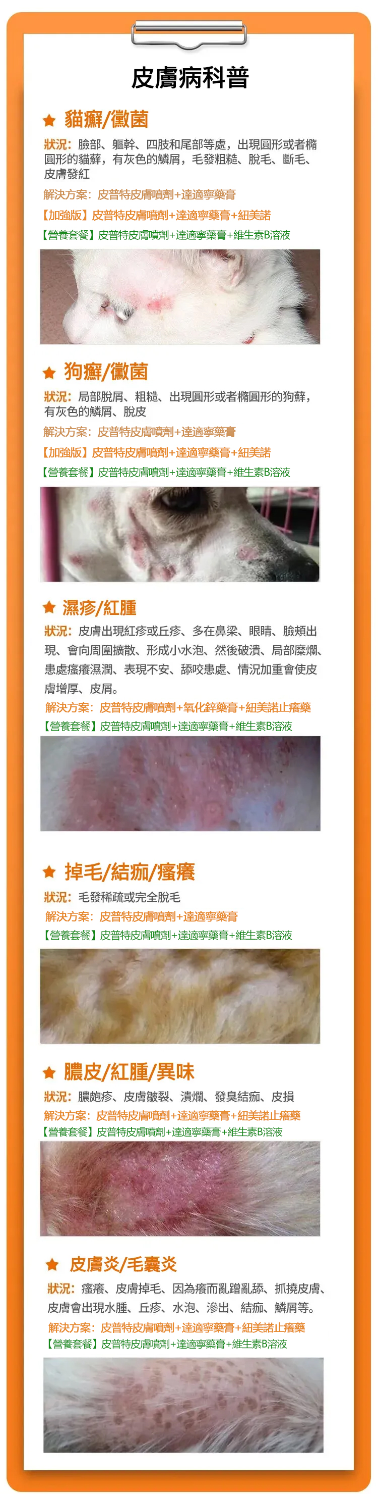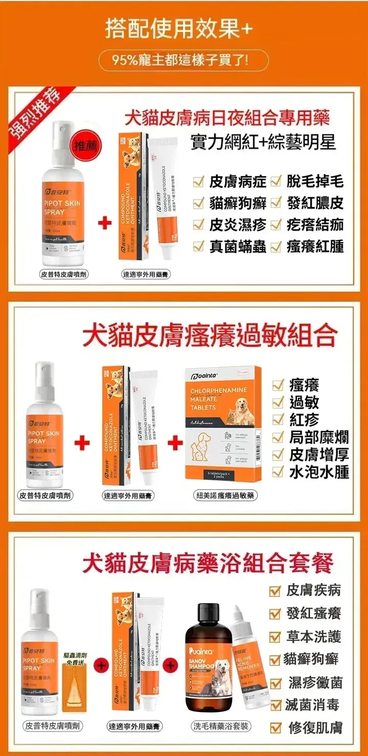 剃掉寵物的體毛,直接噴在皮膚的患處,每天3-5次,最好保持皮膚濕潤,持續5-7天。爲獲得最佳效果,請與維生素一起使用。新舊包裝隨機出貨
