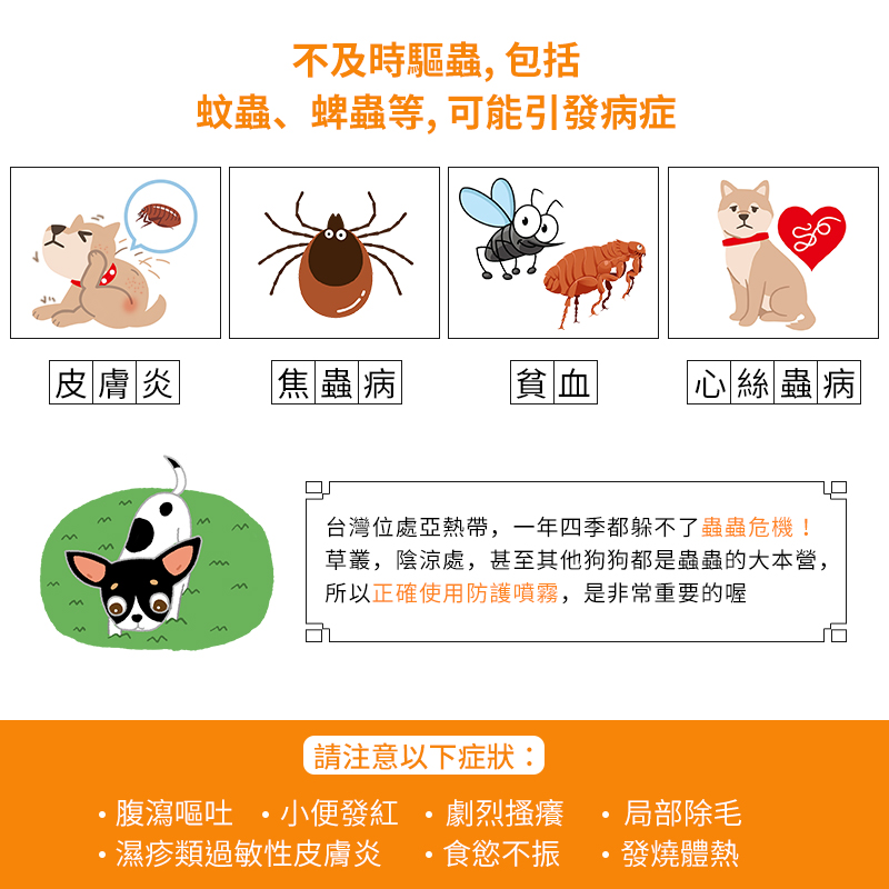 ①每次出門前,距離毛孩約10-15公分,以逆毛方向噴灑於全身