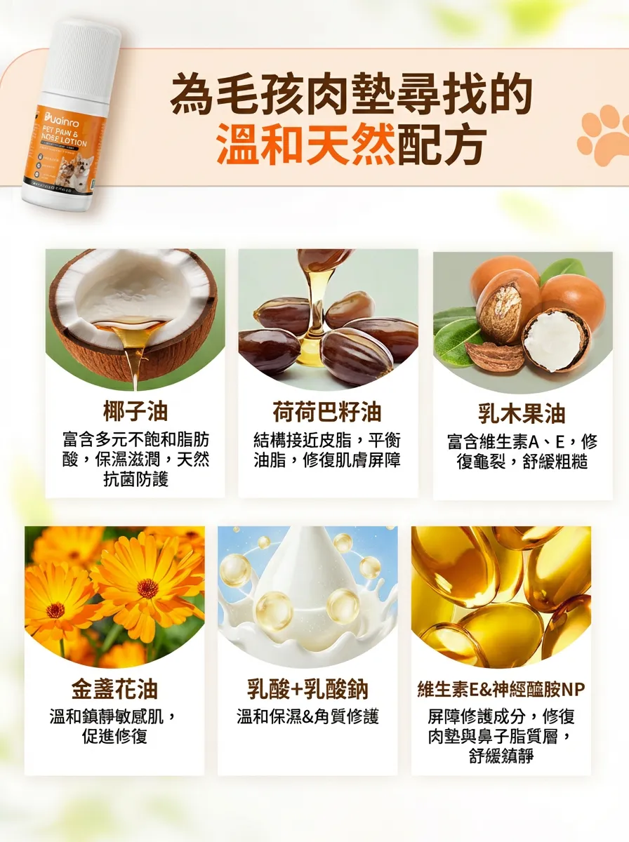 添加椰子油、荷荷芭油、乳木果油、角鯊烷等高保濕滋養成分,能溫和滲透角質層,幫助舒緩因乾燥引起的粗糙與細裂,維持肉球柔軟細嫩、富有彈性。