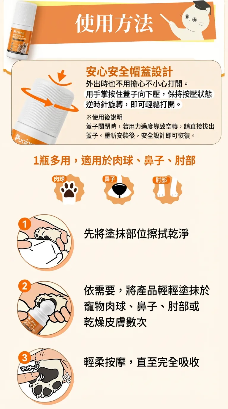 這款寵物護足膏專為狗狗、貓咪容易變得粗糙、乾硬的腳掌肉球所設計,結合修護、滋潤、保濕三重呵護,配方溫和,毛孩即使舔到也安心。