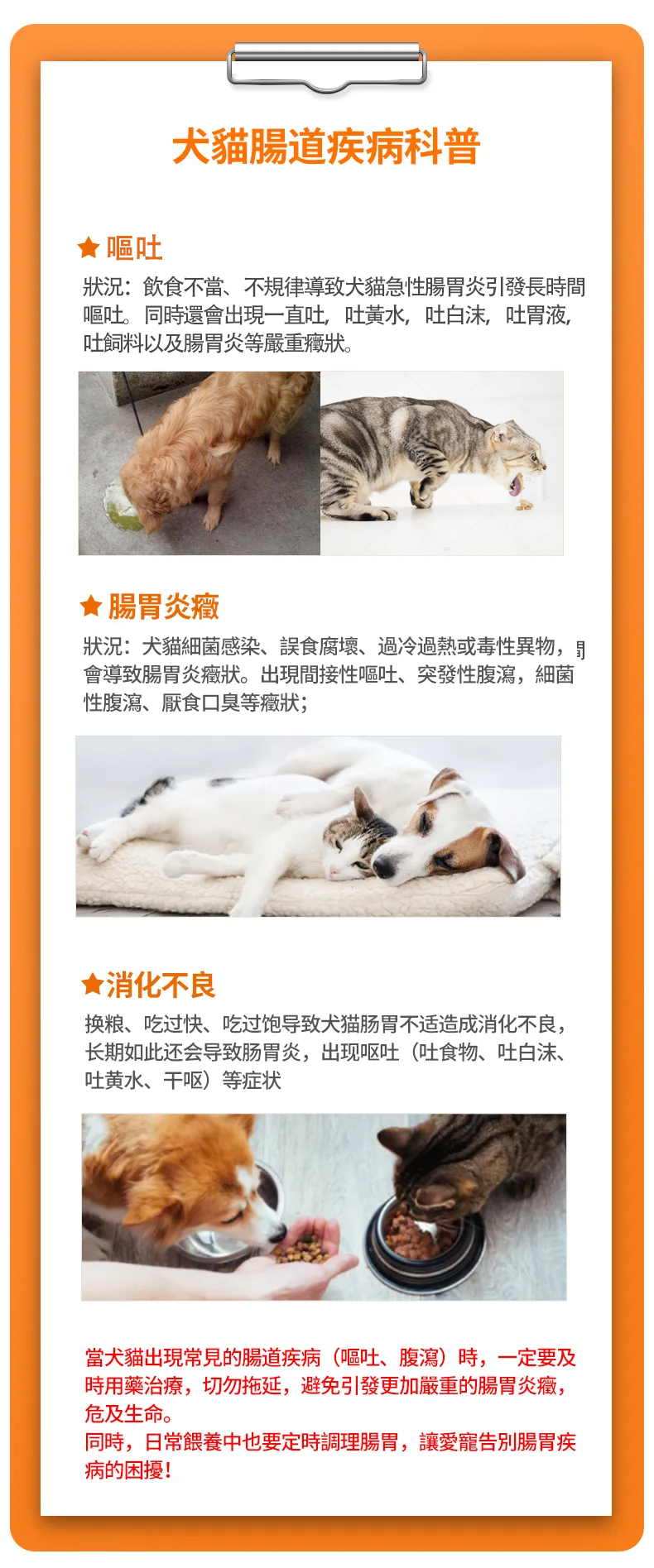 當狗和貓出現嘔吐、吐黃水、吐白沫、吐飼料、乾嘔、消化不良等常見胃腸道疾病症狀時,及時用藥至關重要。 延遲治療可能會導致這些問題升級為更嚴重的胃腸炎,可能構成危及生命的風險。