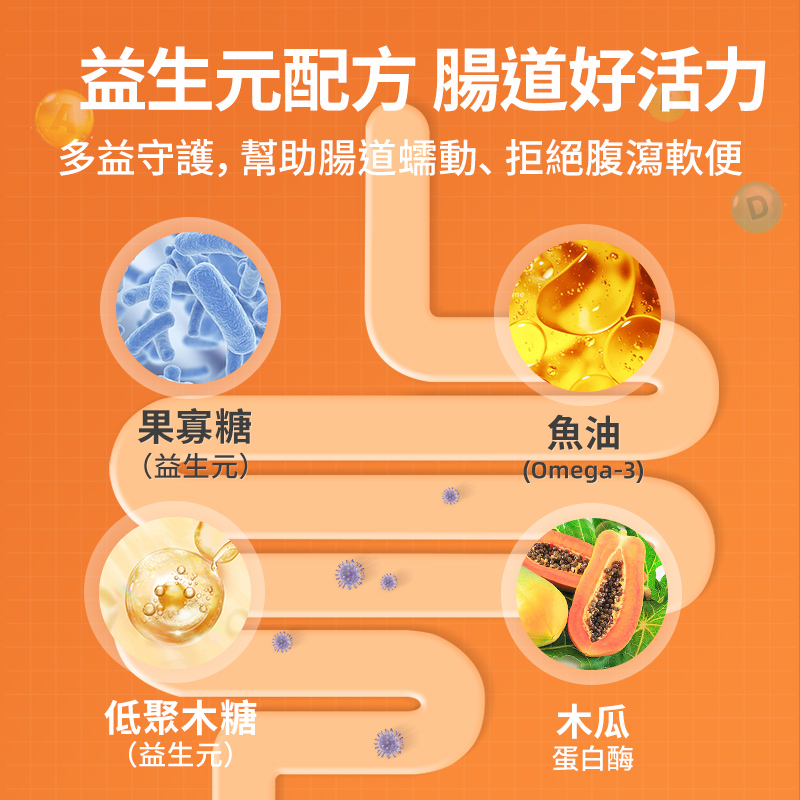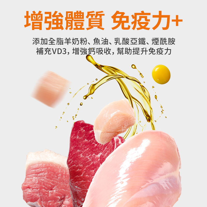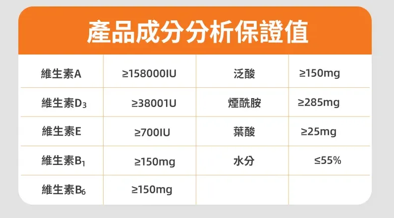 麥芽糖、魚油、葡萄糖、魚粉、全脂羊奶粉、小麥纖維、大麥苗粉、車前草、維生素A、D3、B1、B2、B6、B12、天然維生素E、乳酸亞鐵、氧化鎂、泛酸鈣、葉酸、低聚裹糖、煙酰胺、寡糖、木瓜蛋白酶。
