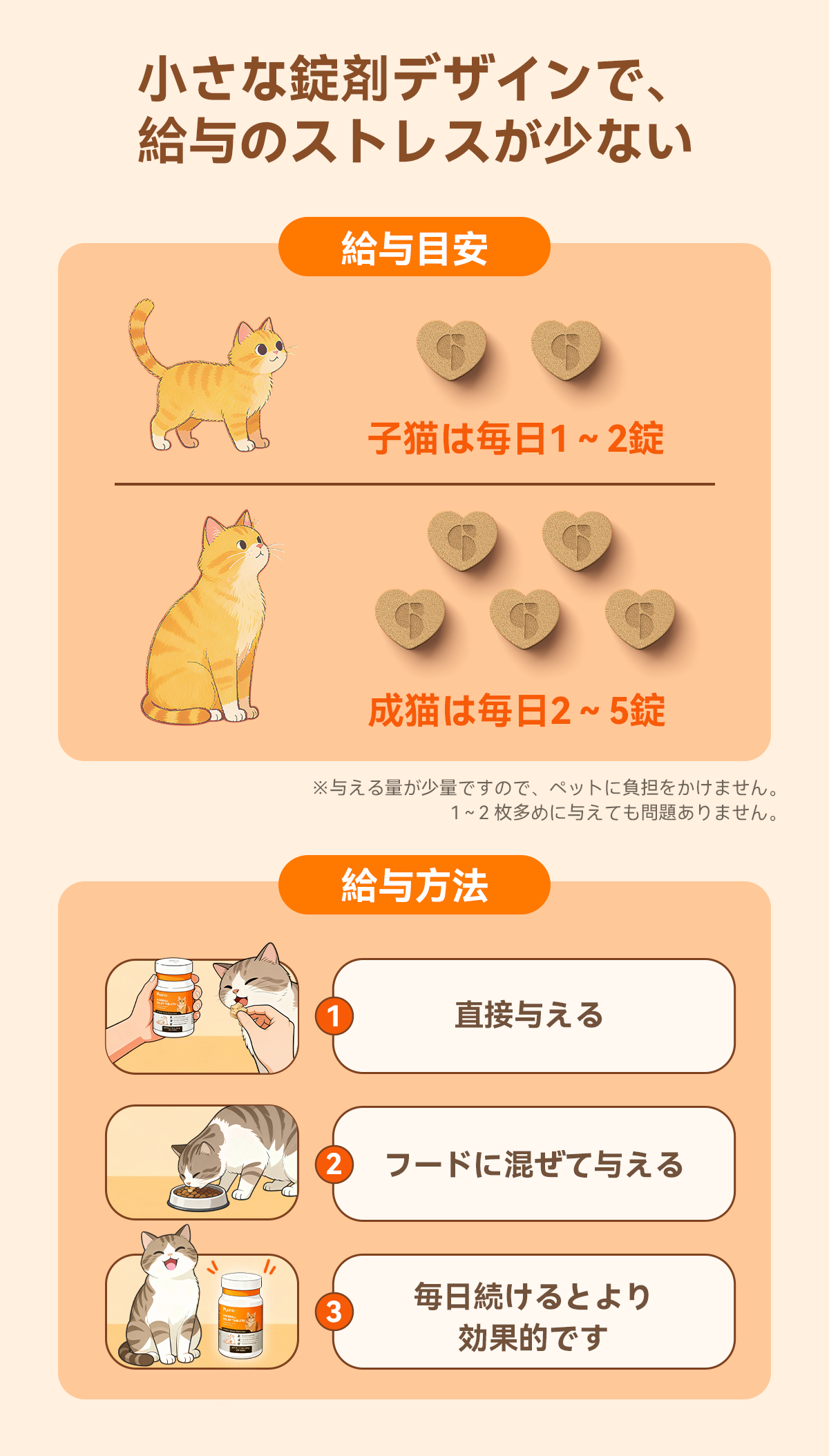 小さな250mgタブレットで、給与が驚くほど簡単。 チキンエキスパウダー配合の美味しさで、猫ちゃんが喜んでパクッと食べてくれます!