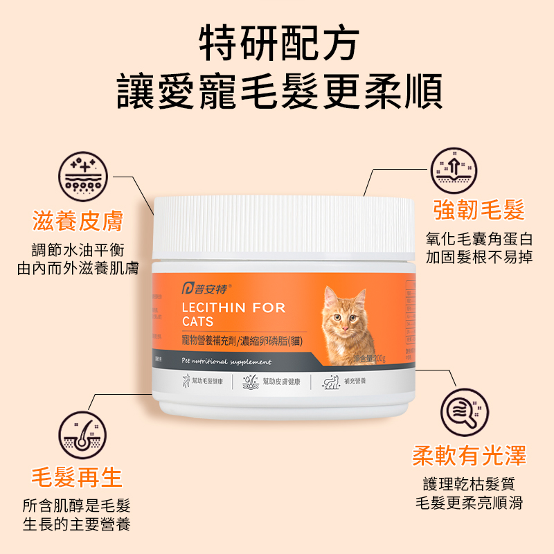 「腦黃金」卵磷脂有助於腦細胞再生,而且富含維生素和抗氧化劑,可以讓頭髮更加亮麗。卵磷脂本身還能分解脂肪,乳化毛球,對貓咪的健康非常有幫助。