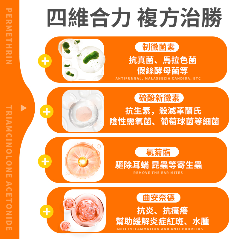 治療耳部感染:適用於中耳炎、外耳炎、內耳炎以及耳部感染引起的症狀,如瘙癢、發紅、腫脹、發炎、異味和過多分泌物。