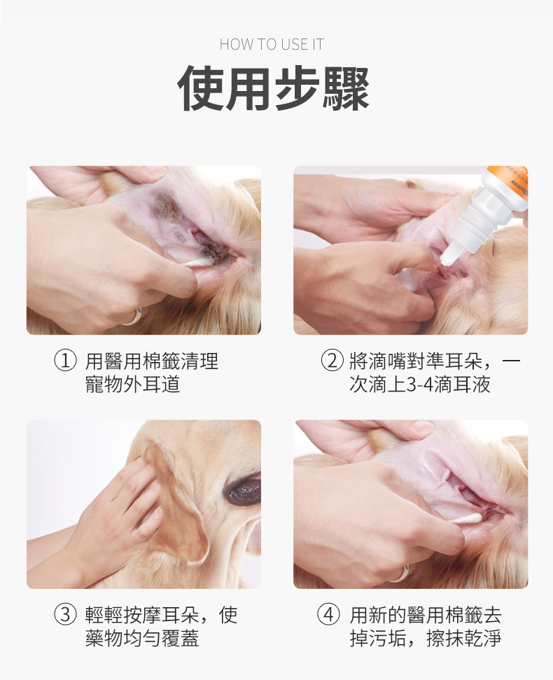 滴耳液:每次3~4滴。每天使用兩次,連續使用5-7天。或依照獸醫的建議使用。