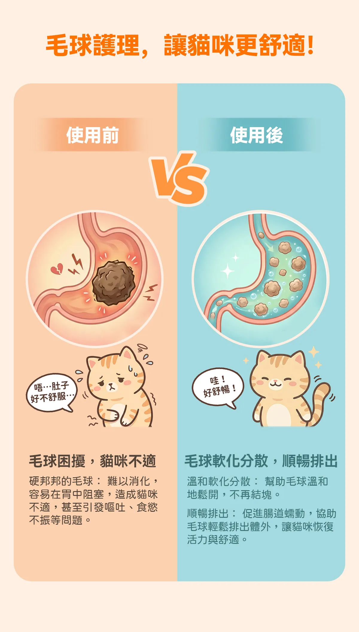 減少毛球堆積,降低嘔吐與腸胃不適