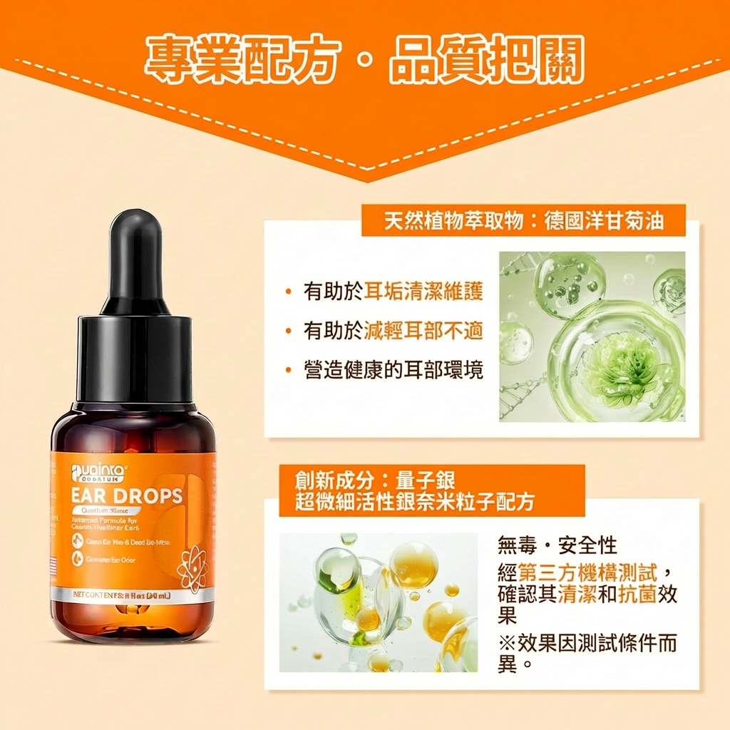 深度清潔與保養:有助於保持耳部環境清潔,幫助清除耳垢堆積,並維持耳部健康平衡。透過溫和地分解耳垢、中和異味與維持耳部自然水分平衡,提升舒適度。