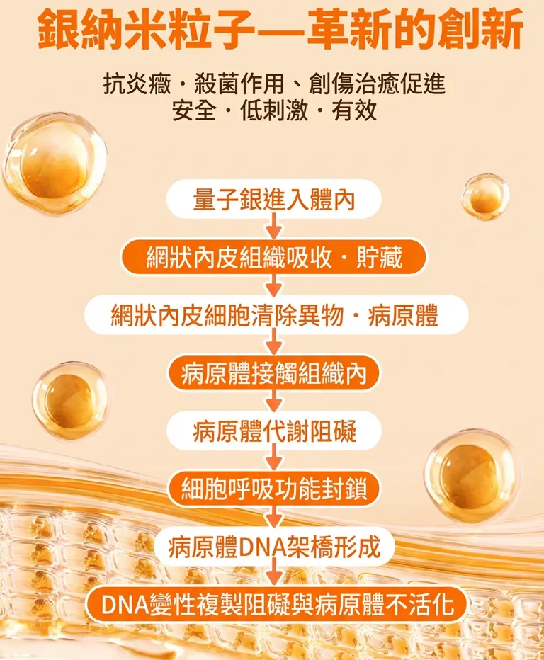 成分:量子銀、洋甘菊花油、純水、丙二醇、PEG-40 氫化蓖麻油、EDTA 二鈉、磺基琥珀酸二乙基己酯鈉。